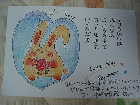プレゼント企画も無理しないでいいよぉ~! ピーちゃんが虹の橋に旅立ってから、もう1ヶ月経ってしまったのね。 病院からのカードも嬉しいし、お友達の優しい気持ちも嬉しいね。 だからもふ、さんも体調崩さないようにしてねぇ~!