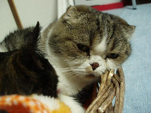 愛するもの:朝昼夜寝とスコ座り スコ座りのプロ。耳折れスコのはずだが、アメリカンカールも入っているかも? ハートブレイクっ鼻の持ち主。 腰に寝癖がチャームポイント・・・ 手足しっぽの短さには定評がある 写真を撮られるのが大きらい。