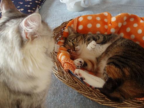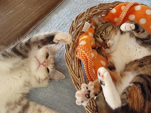 誰に何が当たるのか!? ドキドキします~。 てんちゃんのストライキ、今回は長いですね(笑) よほどあの動画が、心に傷をつけてしまったようで。 ピンチヒッターの、ミーちゃんもしっかり極道家の一員。 負けてませんよ。 でも、タビーちゃんとの遊びはやっぱりかわいい~!! どちらの姿も、大好きです。