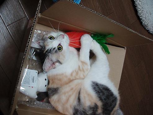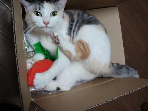 うちもこのキックキャロット大好きですよ。 大きいサイズのがゴロゴロしています(笑) キックコーンも大好きです。 人間が見ていても楽しいし、猫たちも満足っていいおもちゃですよね。