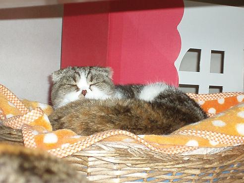 愛するもの:朝昼夜寝とスコ座り スコ座りのプロ。耳折れスコのはずだが、アメリカンカールも入っているかも? ハートブレイクっ鼻の持ち主。 腰に寝癖がチャームポイント・・・ 手足しっぽの短さには定評がある 写真を撮られるのが大きらい。