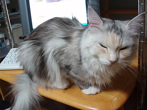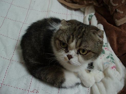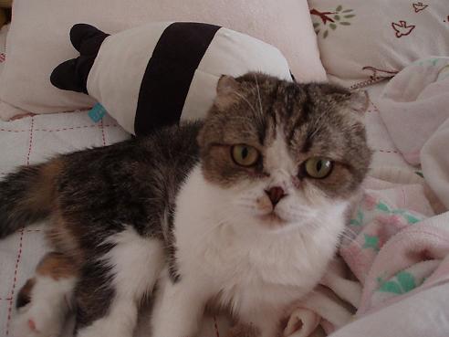 愛するもの:朝昼夜寝とスコ座り スコ座りのプロ。耳折れスコのはずだが、アメリカンカールも入っているかも? ハートブレイクっ鼻の持ち主。 腰に寝癖がチャームポイント・・・ 手足しっぽの短さには定評がある 写真を撮られるのが大きらい。