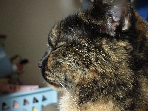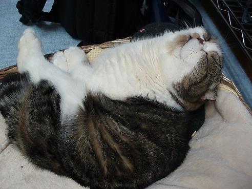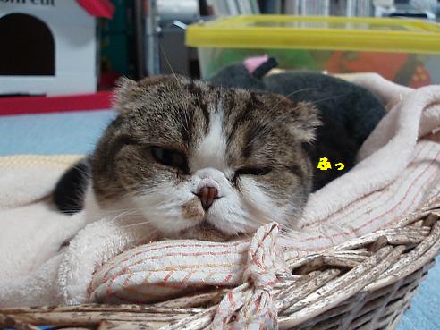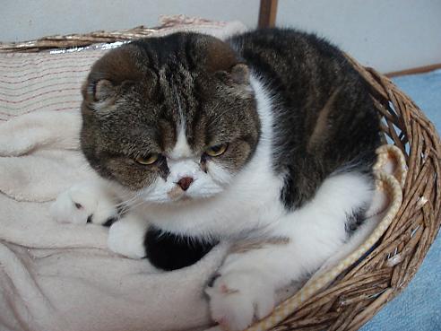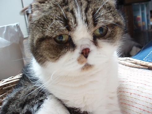 愛するもの:朝昼夜寝とスコ座り スコ座りのプロ。耳折れスコのはずだが、アメリカンカールも入っているかも? ハートブレイクっ鼻の持ち主。 腰に寝癖がチャームポイント・・・ 手足しっぽの短さには定評がある 写真を撮られるのが大きらい。